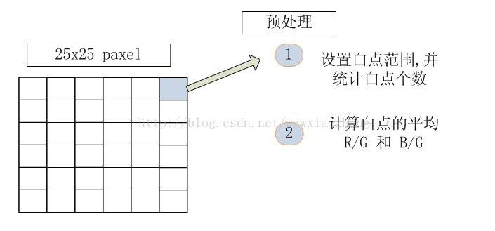 首先简单说一下流程: 1, 取一帧图像数据,并分成MxN块,假设是25x25,并统计每一块的基本信息(,白色像素的数量及R/G/B通道的分量的均值).