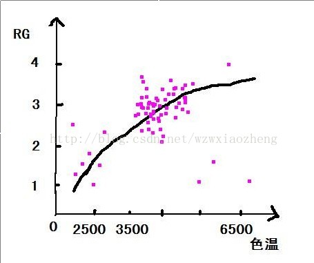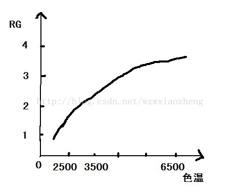 之前拍了6张色温照以及6组矫正参数.可是6够么,当然不够, 插值一下可以得到无数个值,我们把点连成线, 得到了一个神奇的曲线------色温曲线.大概是下面这个样子. 上面提到了三个值(RG,BG,色温),这应该是个三维的.没关系,我们再来一条RG跟色温的曲线,这样只要知道色温,就知道RG,知道RG,就知道BG,知道RG,BG就能轿正了,yes! 至此,我们的前期工作已经全部做完了, 并得到了AWB的色温曲线,下一步只要计算得到当前色温,顺藤摸瓜就能得到当前的矫正参数(Rgain,Bgain),那白平衡的工作就作完了.(放心,当然没这么简单) 2,色温计算 本文主要讲解了白平衡算法中估算当前场景色温的流程. 色温计算的原理并不复杂,但是要做好,还是要细心做好每一步工作,这需要大量的测试,并对算法不断完善.
