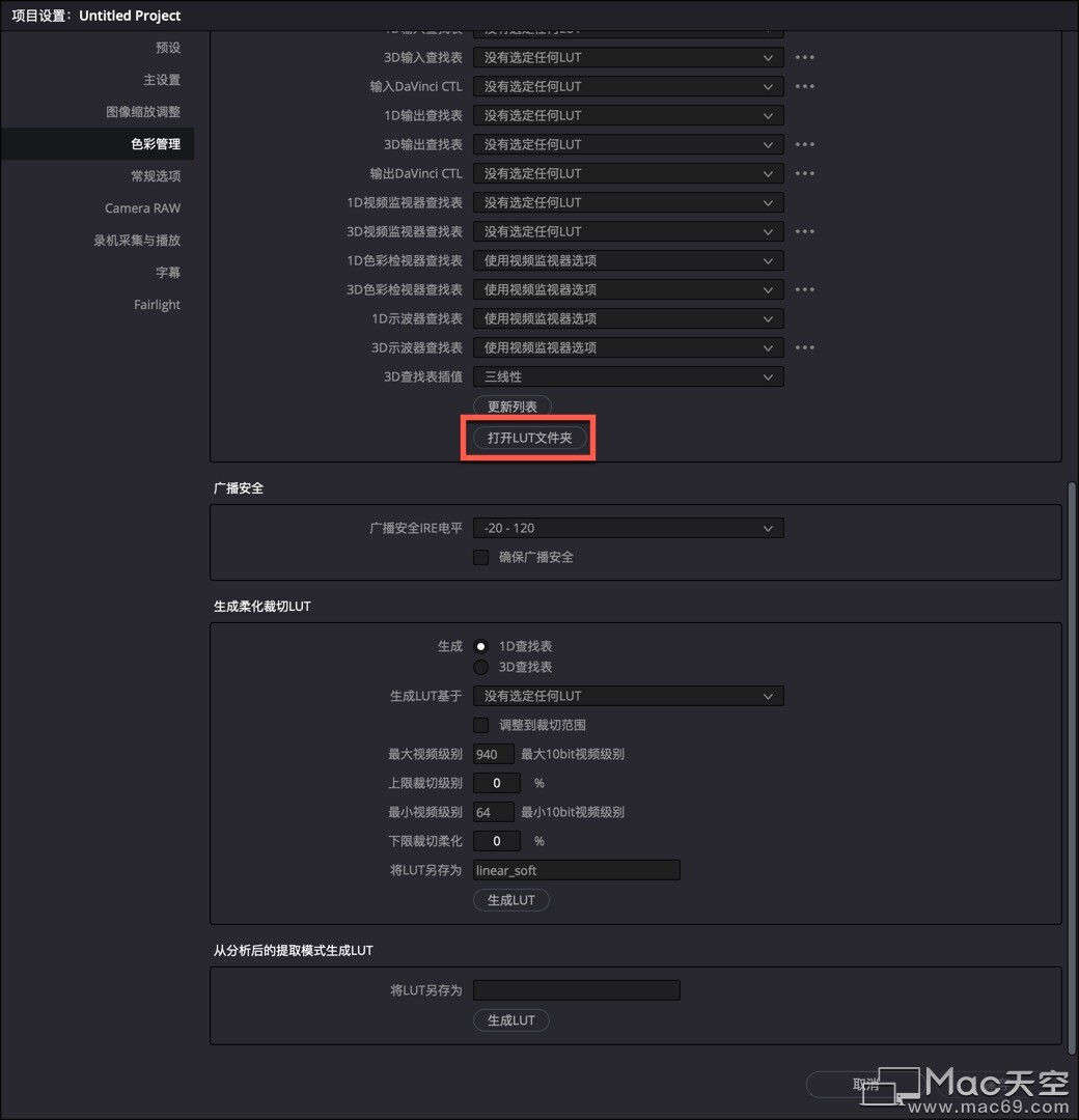 4.将页面下滑,点击【打开LUT文件夹】,如图: