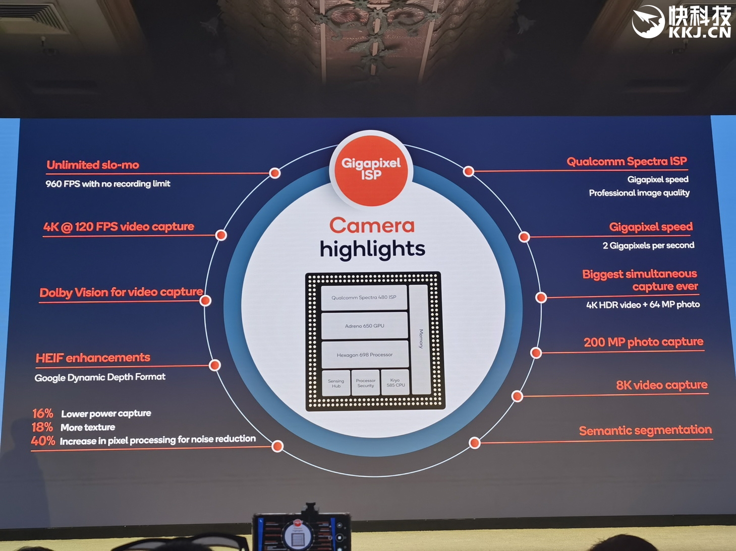 12月12日,高通骁龙™5G 移动平台芯赏会在北京金隅喜来登大酒店如期召开。芯赏会上,高通产品市场高级总监秦牧云分享了骁龙865的camera特性,其中2亿像素拍照,每秒20亿像素处理能力,以及960fps慢录等功能,让当场观众大为震惊。如此高端camera性能史无前例,每一个camera从业者都会为之兴奋,尽管那可能是别人家孩子。