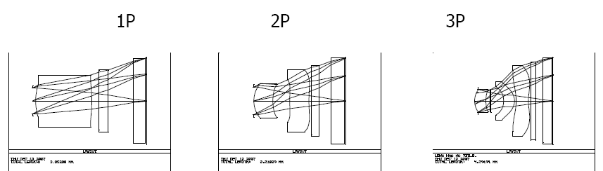 通常摄像头采用的镜头结构有:1P、2P、1G1P、1G2P、2G2P、2G3P、4G、5G等。透镜越多,成本越高,相对成像效果会更出色(个人理解是光线更均匀、更细致;对光线的选通更丰富;成像畸变更小,但是会导致镜头变长,光通量变小)。
