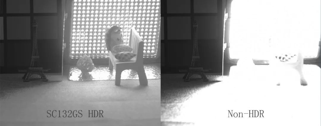 在光线有明暗变化的时候,左图Global shutter sensor不会有明暗瑕疵,可以做到单帧HDR。