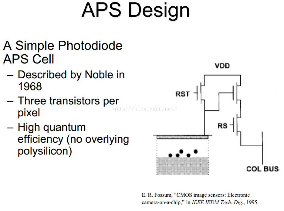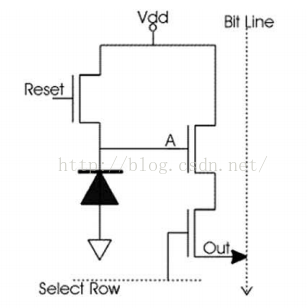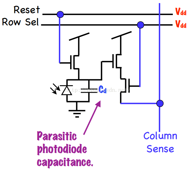 CMOS传感器则不同,CMOS传感器在每个像素处即将电荷转换为了电压,因而导致了很多独特的优缺点,如今已经在绝大多数应用中代替了CCD。第一代CMOS传感器技术为PPS(passive pixelssensor),第二代为APS(active pixels sensor)。基本原理如下,一个典型的APS电路如图4-6所示。根据我的理解,CMOS实现电荷转电压的关键在相应的寄生电容,因为光电二极管是受光照产生电流,而不是电压。首先,产生RST复位信号,寄生电容Cd充电至VDD,接着曝光开始,RST关闭。如图7所示,受到光照后,光电二极管产生电流,对电容进行放电。由于放电电流正比于光强,因此放电失去电荷正比于光强x曝光时间。由于电容Q=C*V, 即V=Q/C,电容上的电压正比于里面储存的电荷大小,因此曝光完毕,RS信号使能,读出电容上的电压即可得到光强信息(这里光强越强,曝光越长,采集到的电压越低,看似与常规感受到的图像越亮相反,但只需要后期电路稍微处理下即可,比如用复位电压减去采样电压(简单的相关双采样CDS技术,可以大大降低CMOS的FPN))。