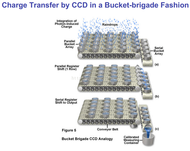 CCD传感器基本工作原理是,光照射每个像素产生电荷,并累积。由于CCD只有一个读出端口,因此需要串行的将每个像素的电荷在像素之间进行转移到输出端口。最终将电荷转换为电压,进行放大和AD转换得到图像。电荷转移示意图如下