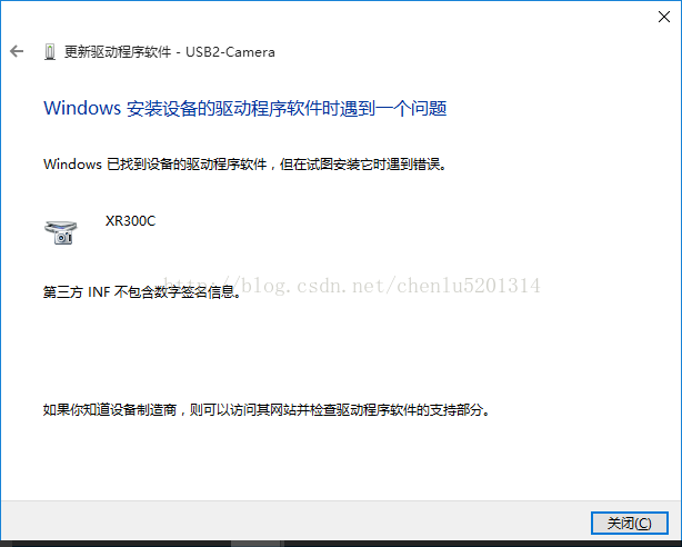 更新驱动程序软件 - USB2-CameraWindows安装设备的驱动程序软件时遇到一个问题Windows 已找到设备的驱动程序软件,但在试图安装它时遇到错误。 XR300C第三方INF 不包含数字签名信息。如果你知道设备制造商,则可以访问其网站并检查驱动程序软件的支持部分。