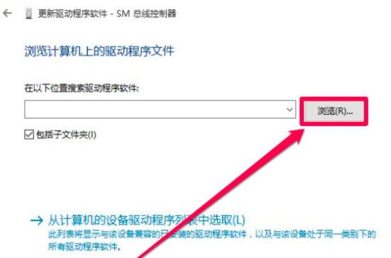 来到这个界面,需要手动指定驱动文件存放的位置,在指定之前,要勾选“包含子文件夹”这一项,再按“浏览”按钮。