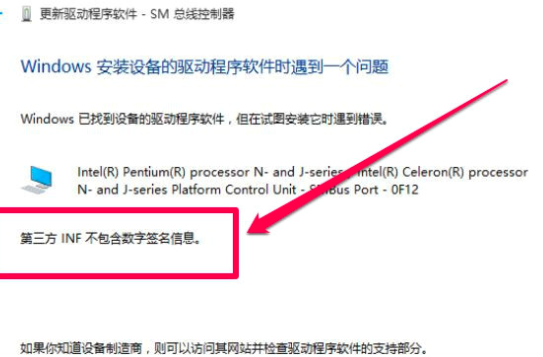 把路径加载到编辑框内后,按“下一步”开始自动安装驱动程序,但是,经过一阵安装后,弹了一个提示窗口“Windows 安装设备的驱动程序软件时遇到一个问题,第三方INF不包含数字签名信息”,其意思很简单,驱动程序安装没成功,因为没有数字签名。