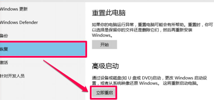 - 到更新与安全窗口,先在左侧选项中选择“恢复”这一项,然后到恢复的右侧窗口,选择“高级启动”的“立即重启”按钮。 为什么要立即重启电脑,原来禁用驱动程序强制签名需要在开机启动的高级模式下,才能设置