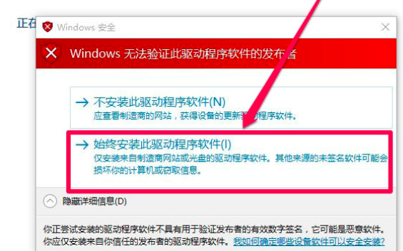 - 当启动驱动程序更新后,然后按上面1-4的步骤,选择驱动文件夹,安装时,会弹出一个“Windows 安全”警告窗口,在此时,选择“始终安装此驱动程序软件”这一项。
