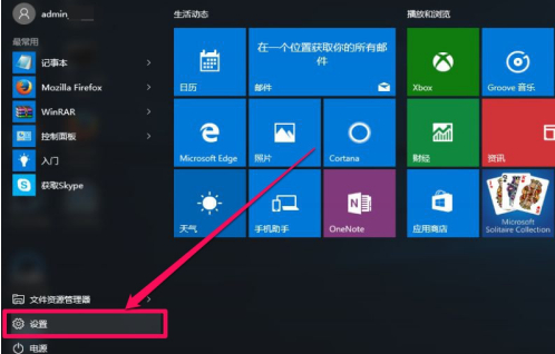 先在Win10的桌面打开任务栏左下角“开始” 图标,选择其中的“设置”。