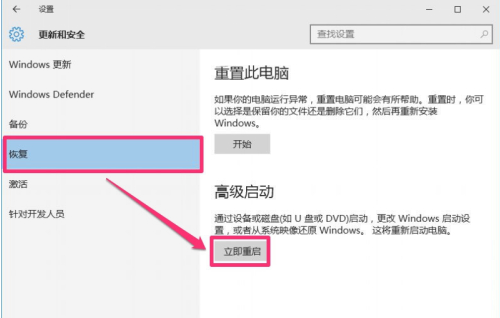 3、到更新与安全窗口,先在左侧选项中选择“恢复”这一项,然后到恢复的右侧窗口,选择“高级启动”的“立即重启”按钮。