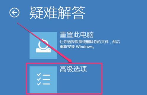 5、进入疑难解答窗口,这里比上一个界面简单,只有两个选项,一个“重置此电脑”,一个“高级选项”,重置此电脑,是让你先保存重要的磁盘文件,然后重装Windows系统,这肯定不是我们想要的,所以,也就知道,要选择“高级选项”这一项了。