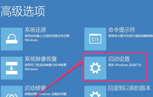 6、 进入高级选项窗口后,还要进行选择,Window10禁用驱动程序强制签名还真麻烦,这里选项非常多,有“系统还原”,“系统映像恢复”,“启动修复”,“命令提示符”,“启动设置”,“回退到以前版本”,这些都是中文的,其功能一看就懂,不需要解释,这里直接选择“启动设置”即可。