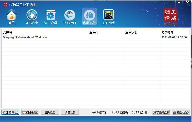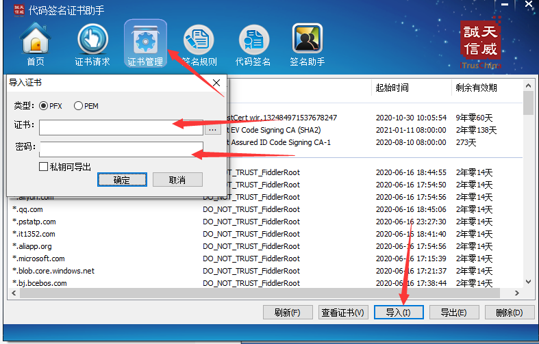2 打开iTrusSignTool.exe 选择证书管理,点击导入pfx证书