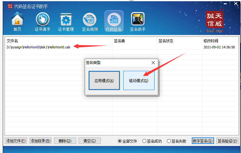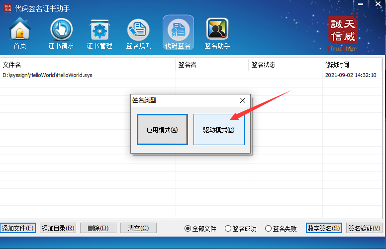 6.在点代码签名,添加sys文件,点击数字签名,选择驱动模式