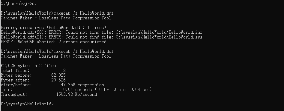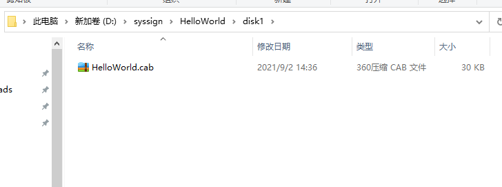 7. 命令行进入sys目录输入makecab /f HelloWorld.ddf,此时会生成disk1/helloworld.cab