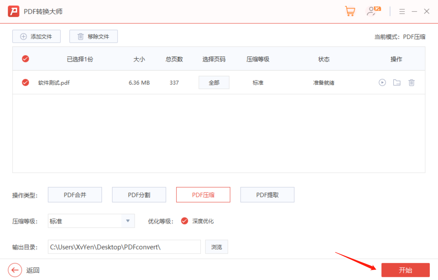 点击进入【PDF压缩】,导入PDF文件,选择相关参数之后点击【开始】就可以开始压缩PDF文件。
