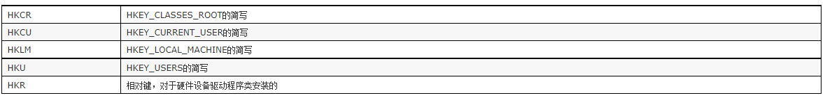 在实际编写INF文件时,注册表根键通常采用缩写方式,如下表: