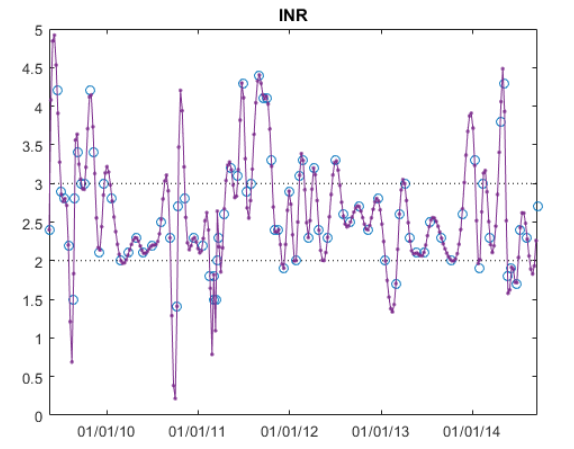 该文件INR.mat包含在五年内对患者进行的INR测量。该文件包括一个datetime数组,其中包含每次测量的日期和时间,以及一个带有相应INR读数的矢量。加载数据。
