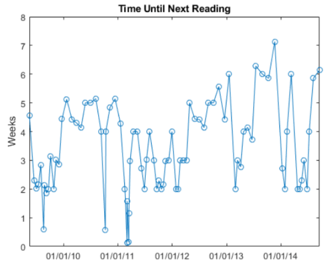每次INR读数确定何时必须对患者进行测试。使用diff构建测量之间的时间间隔的向量。以周为单位表示间隔,并使用与以前相同的x轴绘制它们。