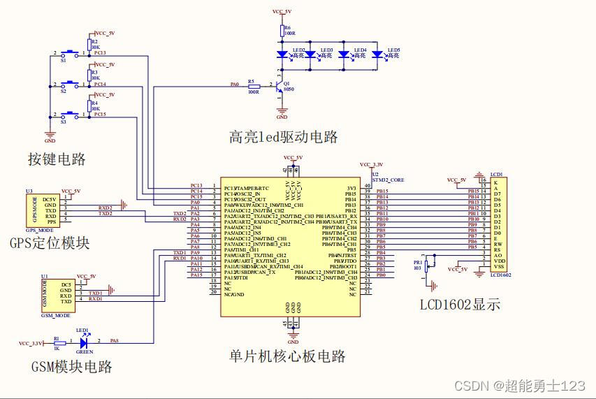 整体电路主要由STM32单片机核心板,LCD1602液晶显示电路,GPS模块,GSM模块,按键电路,LED灯电路及电源电路组成;原理图如图: