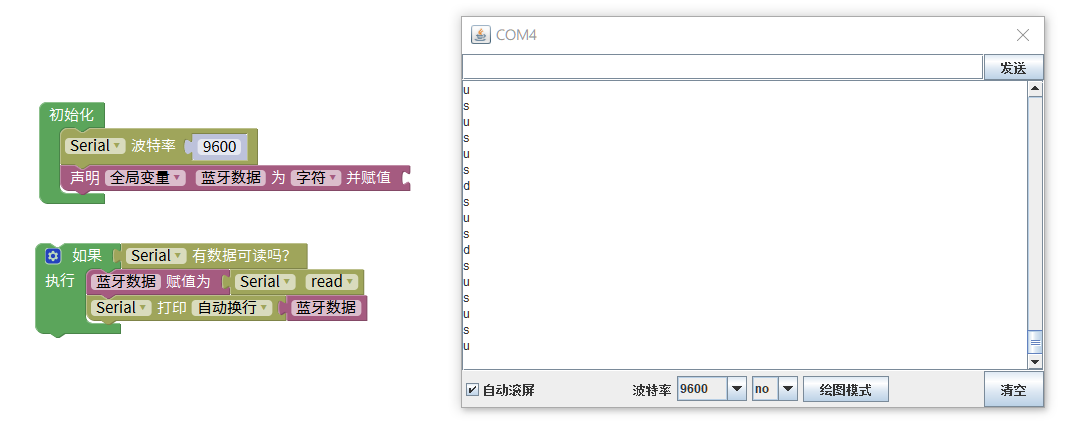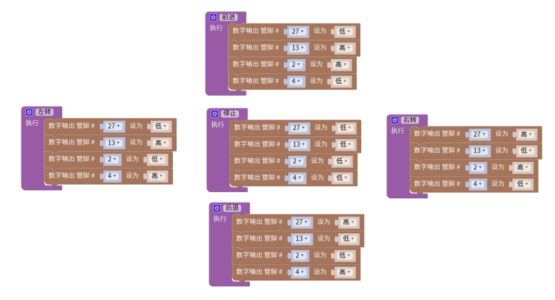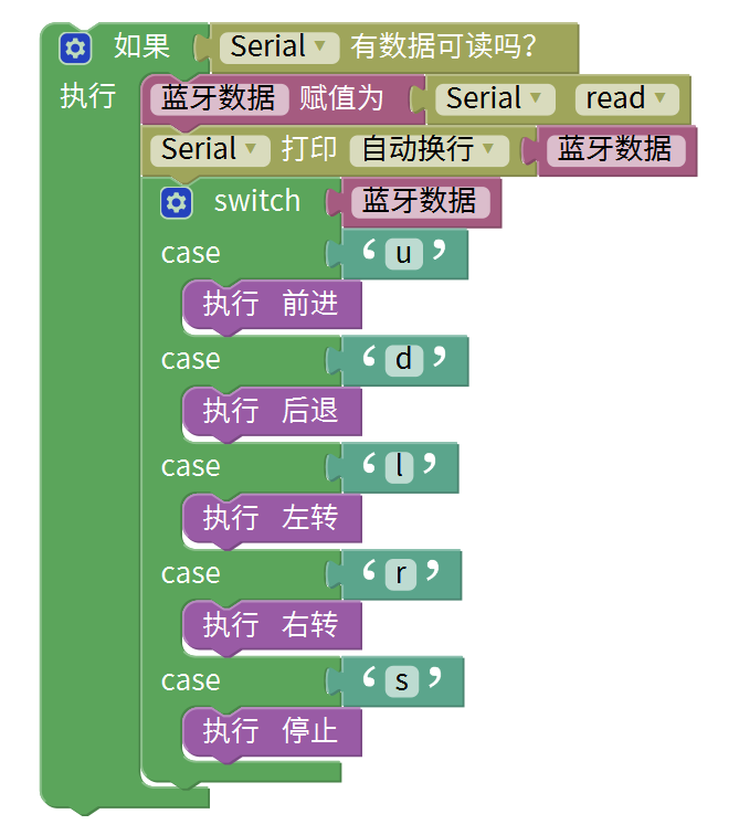 2、根据接收到的数据,执行对应的程序:前进、后退、左转、右转、停止