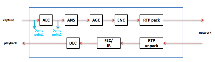 3) 把编码和解码形成loopback,即把编码后的码流立刻放进解码器得到pcm数据再playback出来,听下来是好的说明问题出在网络侧,不好说明问题出在编解码里面。
