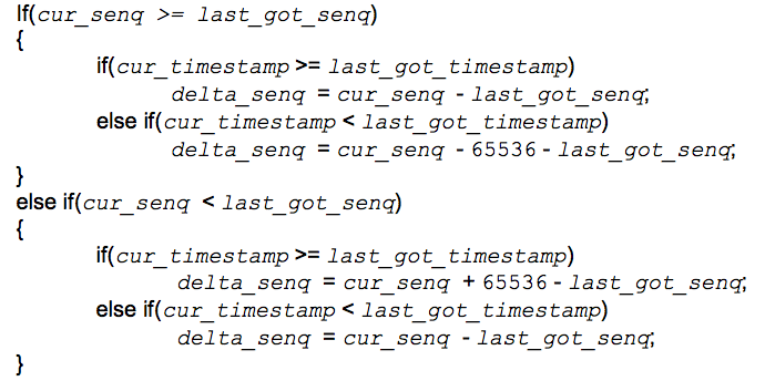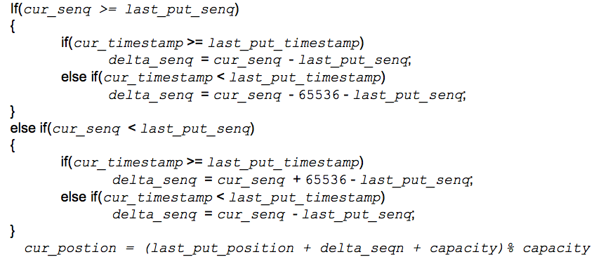 接下来看怎么把包放到正确的位置上。对于收到的第一个包,它的位置(position,范围是0 ~ capacity-1)是sequence number % capacity。后面的包放的position依赖于它上一个已放好的包的position。设上一个已放好的包的sequence number为 last_put_senq,timestamp 为last_put_timestamp,position为last_put_position,当前收到的将要放的包的sequence number为 cur_senq,timestamp 为cur_timestamp,position为cur_position,当前的包的sequence number与上一个放好的sequence number的gap为delta_senq,则cur_position可以根据下面的逻辑关系得到。
