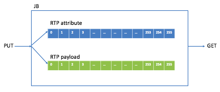 首先看PUT操作。RTP包有包头和负载(payload),为了便于处理,将包头和payload在buffer中分开保存,保存包头中相关属性的叫attribute buffer,保存payload的叫payload buffer。下图是JB里存RTP包的buffer关系图:
