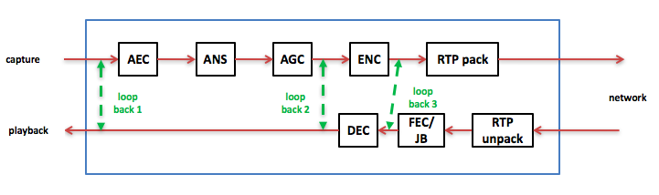 loopback音频数据就是形成回环,从而来排查问题。还是以上面的语音通信软件框图为例,有几种不同层次的loopback,见下图: