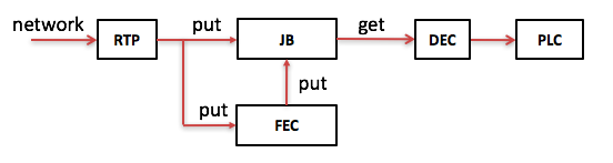 从网络收到的RTP包如是原始包不仅要PUT进JB,还要PUT进FEC。如是冗余包则只PUT进FEC,在FEC中如果一组包中原始包的个数加上冗余包的个数达到指定值就开始做FEC解码得到丢失的原始包,并把那些丢失的原始包PUT进JB。在需要的时候把语音帧从JB中GET出解码并有可能做PLC。