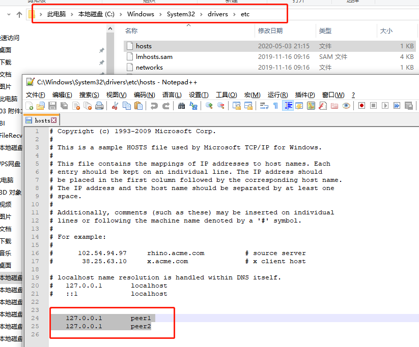 本文要实现的是在一台主机上双注册中心,如果不同的物理机器上此步骤可忽略。首先要在电脑上的C:WindowsSystem32driversetchosts文件添加如下内容,