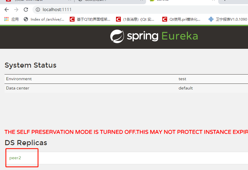 5.以上便完成了两个注册中心的搭建,下面测试,启动两个注册中心,并在浏览器中输入:http://localhost:1111/如下图:表明注册中心搭建完成