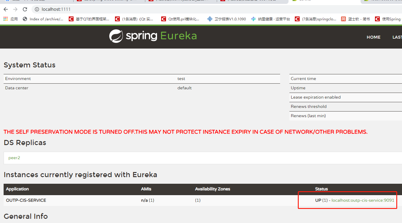 6.以上便完成了服务得搭建,启动该服务。刷新http://localhost:1111/网页。查看一下多了一个服务,服务名为outp-cis-service