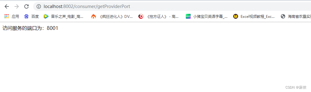 重启我们的消费者项目,在网页里面输入请求地址http://localhost:8002/consumer/getProviderPort,可以看到访问成功且返回的是provider的端口号