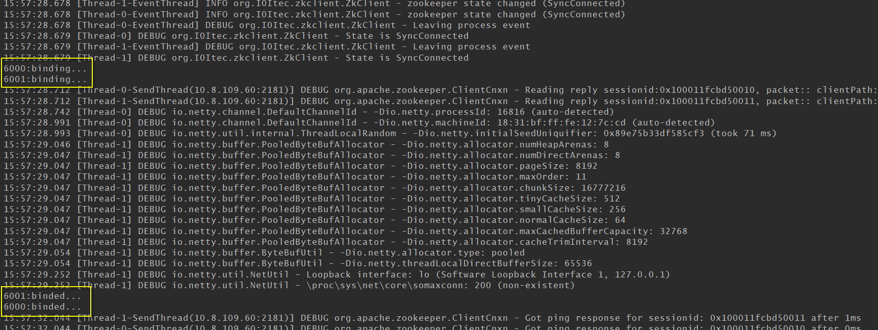 启动对应的ZooKeeper服务器,开放端口(或关闭防火墙),然后再启动服务端的测试函数,最后再运行客户端的测试函数,控制台输出: