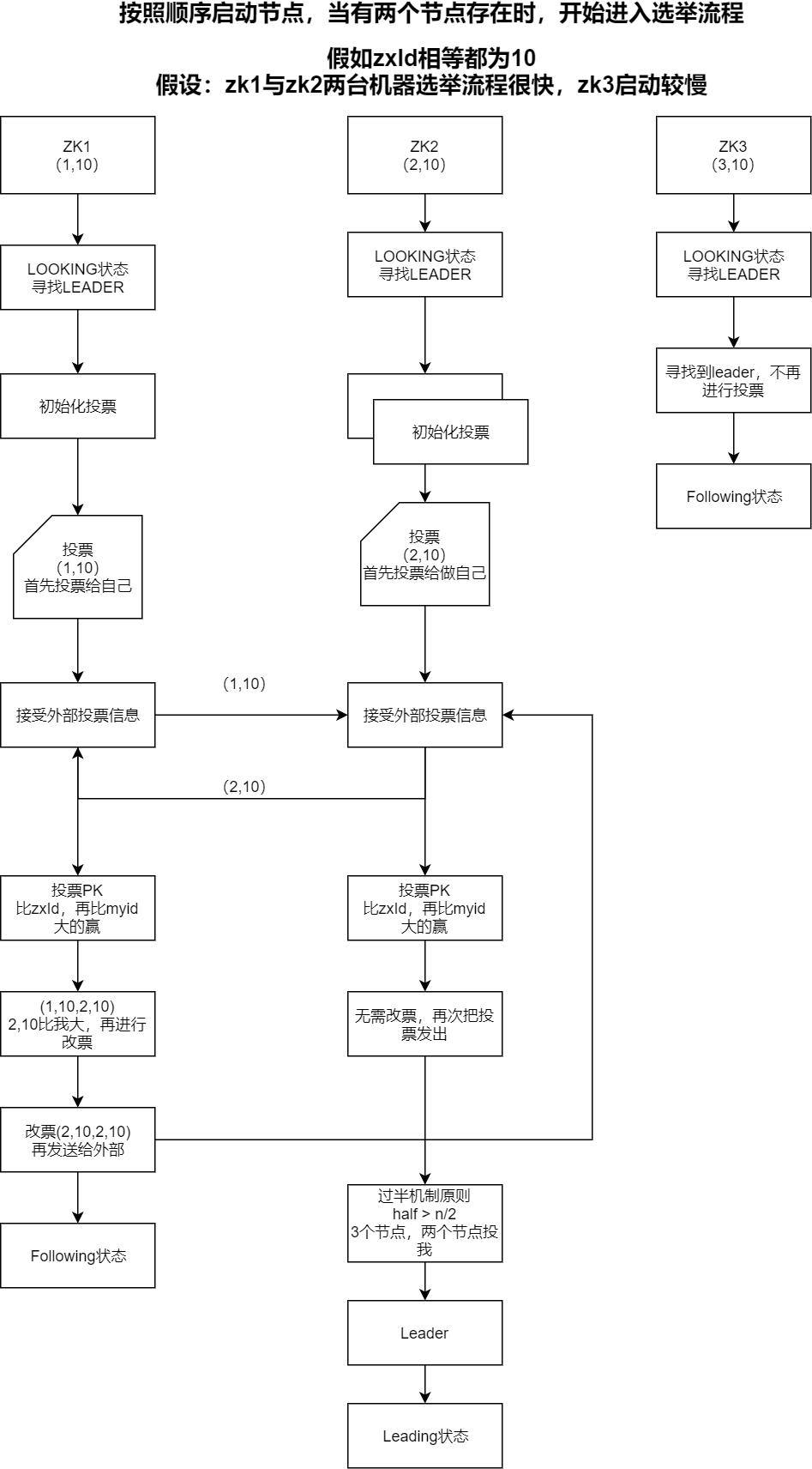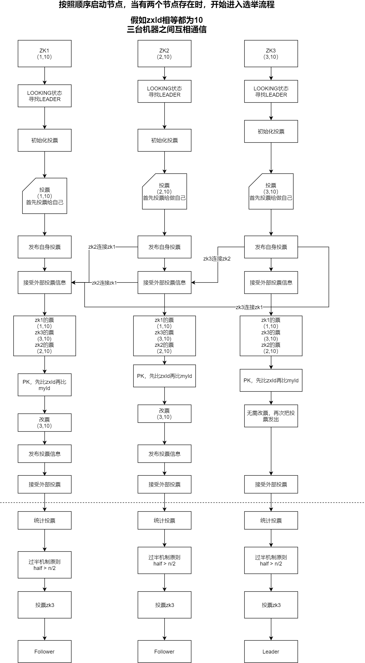 1、按照顺序启动zk1,zk2,zk3, 假设三台zk的zxId相同,myid分别是1,2,3,ZooKeeper的集群规模至少是2台机器。