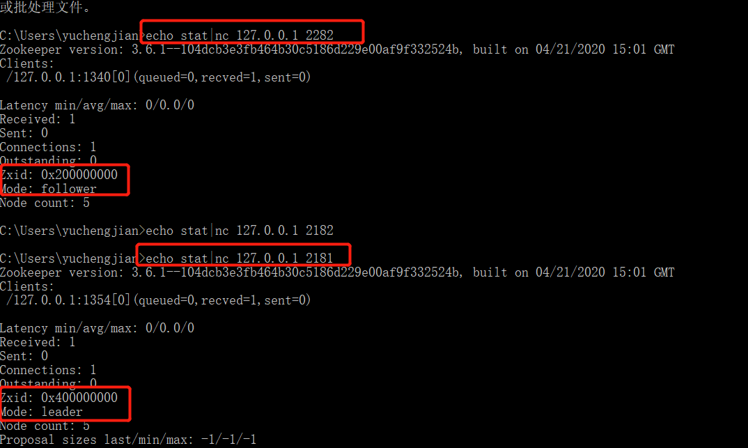 2.依次启动,启动后,无法使用zkServer.cmd status命令,无法观察哪一个节点是leader,各种查阅后,发现zkServer.cmd在windows上就是用不了,硬伤啊。google一下后,发现可以使用nc命令去查看状态,参考博客:https://blog.csdn.net/hongweigg/article/details/52933113