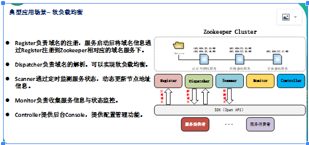 提供的服务包括:分布式消息同步和协调机制、服务器节点动态上下线、统一配置管理、负载均衡、集群管理,分布式锁