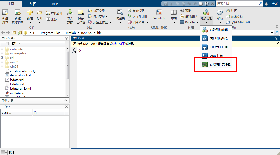 打开MATLAB,点击 附加功能,点击 获取硬件支持包