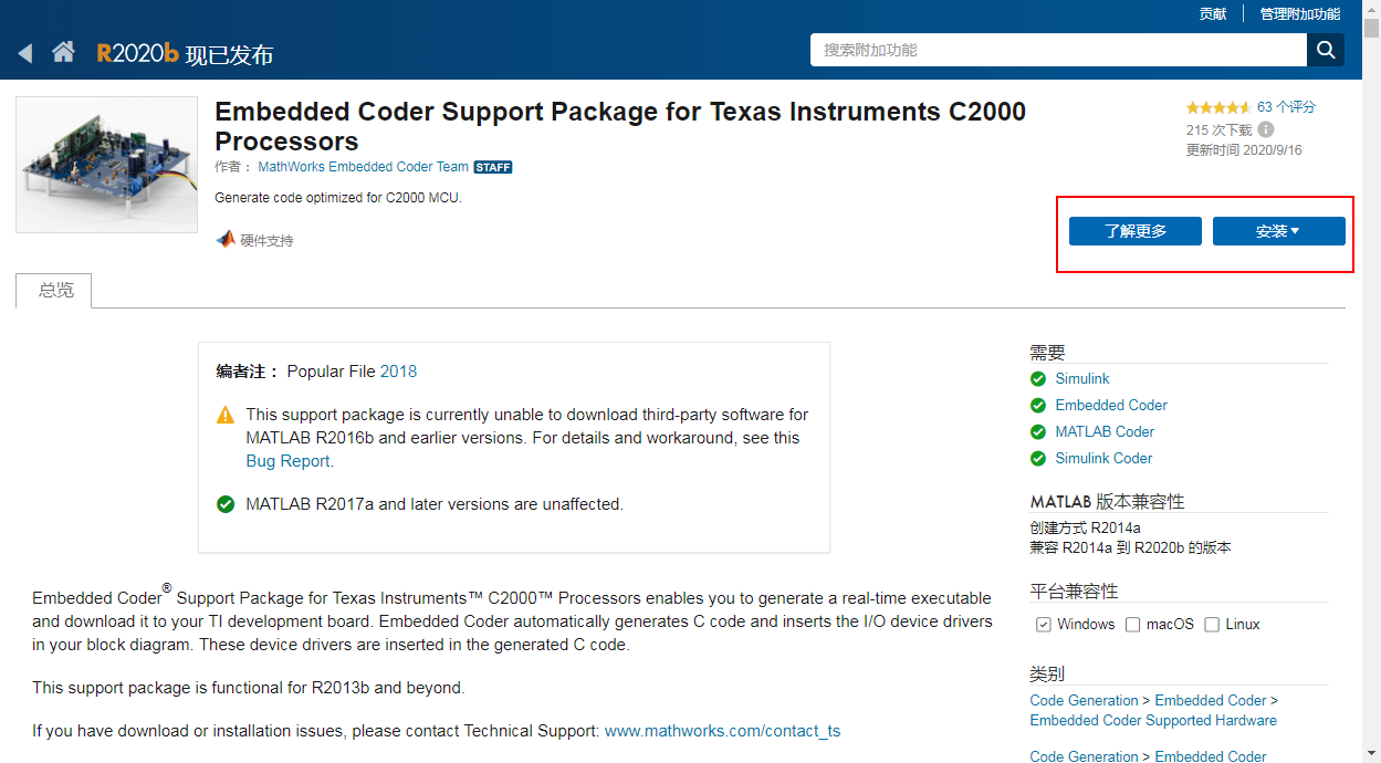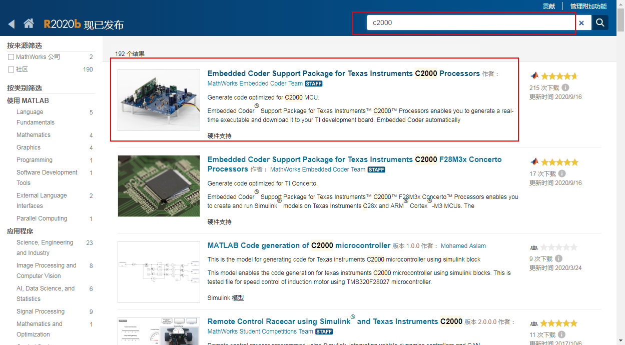 搜索框 搜索C2000,选择Embedded Coder Support Package forTexas Instruments C2000 Processors。
