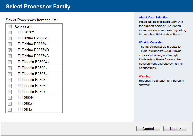 选择TI Delfino F2837xD(使用的芯片),点击 Next。