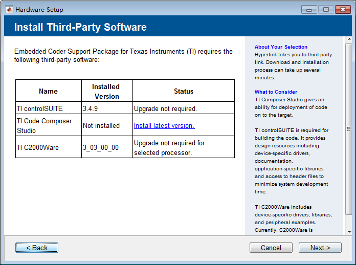 以上就是瘦瘦小天鹅最近收集整理的关于自动代码生成应用笔记(1)——Matlab c2000自动代码生成环境搭建0 安装软件列表1 controlSUITE 安装2 C2000Ware的安装3 Matlab C2000 Coder安装的全部内容,更多相关自动代码生成应用笔记(1)——Matlab内容请搜索靠谱客的其他文章。
