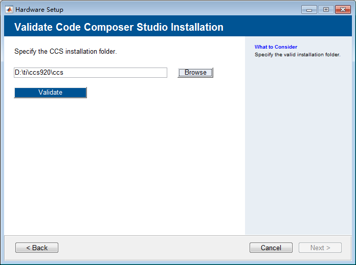 修改路径为ticcs920ccs安装目录,点击Validate。