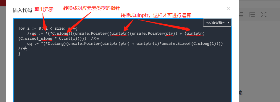 qq := *(*C.ulong)(unsafe.Pointer(uintptr(ptr) + uintptr(i)*unsafe.Sizeof(C.ulong(1)))) //法二