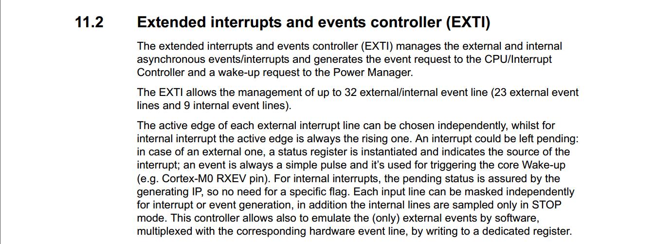 - EXTI允许管理多达32个外部/内部事件行(23个外部事件行和9个内部事件行)。