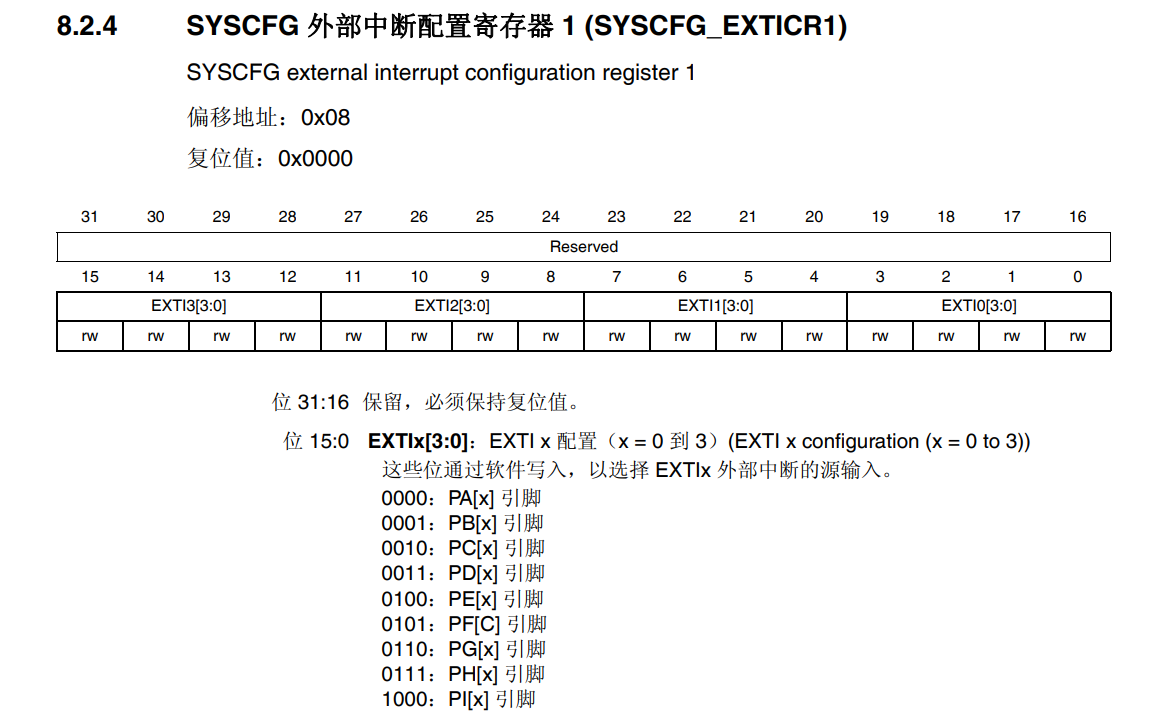 所以它是使用哪个寄存器配置的呢:使用的是SYSCFG外部中断配置寄存器(一共有4个)