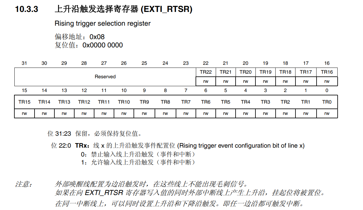 最后是,EXTI_PR寄存器内容输出到NVIC内,从而实现系统中断事件控制。