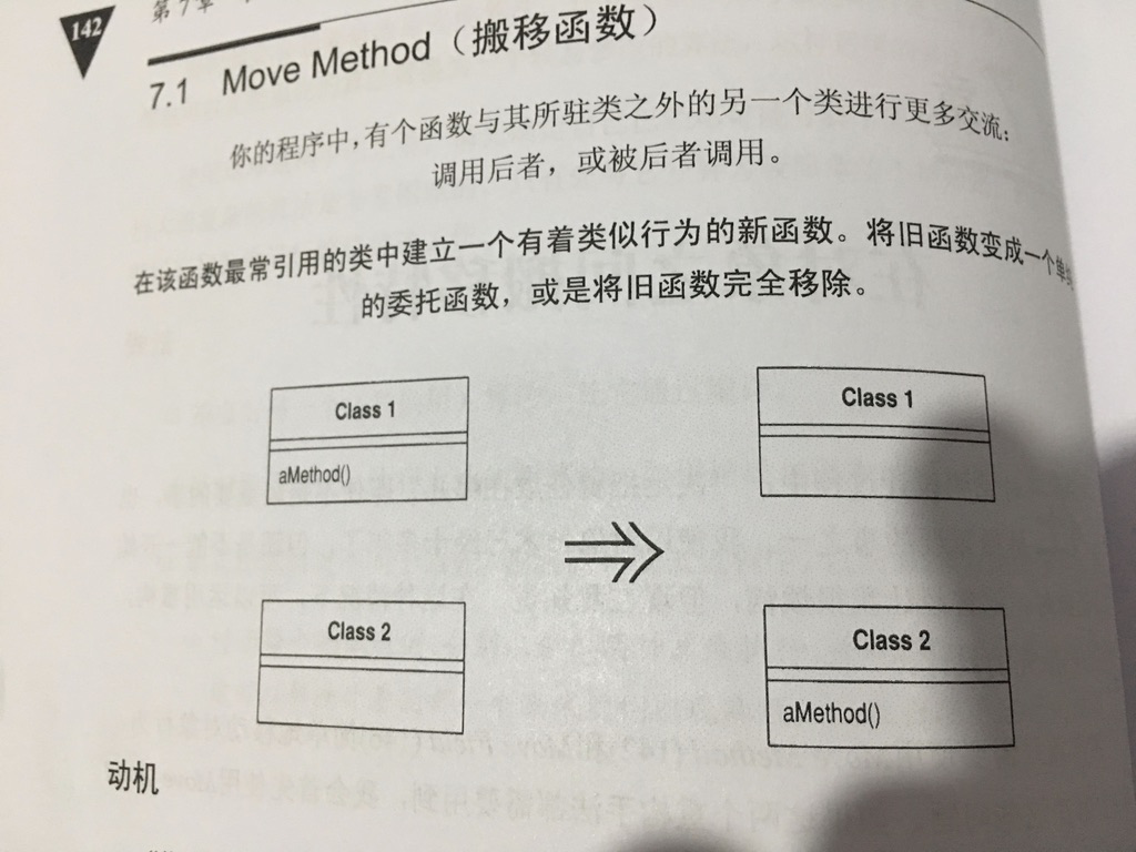 - 搬移函数:再函数最常应用的类建立一个有着类似行为的新函数,将旧函数变成一个单纯的委托函数或是将旧函数完全移除。