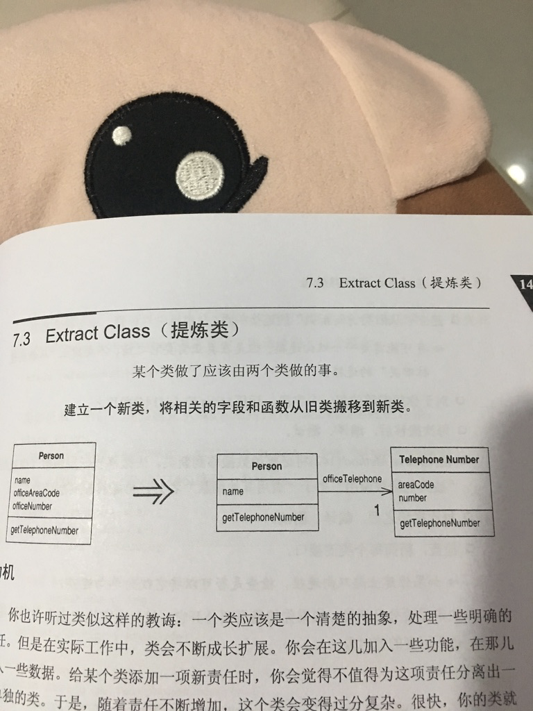 - 提炼类:建立一个新类,将相关的字段和函数从旧类搬移到新类。